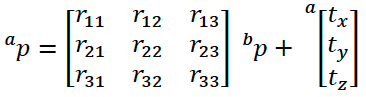 ]The combined homogenous transformation transforms a point from the depth frame into the pose frame. Mathematically this transformation is written as follows:
