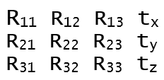 where Rij are the components of the row-major rotation matrix R and [t<sub>x</sub>, t<sub>y</sub>, t<sub>z</sub>]T is the translation vector (in meters). The transformation expresses the D435 depth frame (which coincides with the left infrared imager) with respect to the T265 body frame (as defined in the Tracking Camera Datasheet). Please also refer to Figure 1 for a visualization of the coordinate frames.