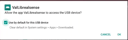- Start the vallibrealsese app with a camera connected and when showed the following dialog, check “Use by default for this USB device” box and tap ok