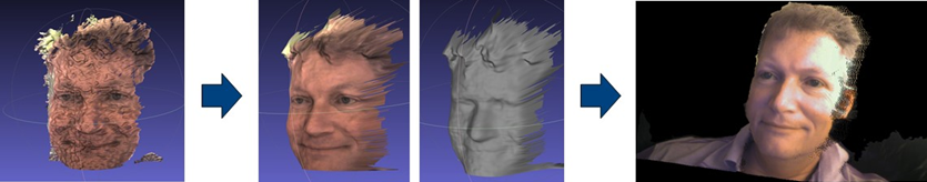 Figure 4. A 3D-Selfie. The single photo was taken outside in full sunlight with a Depth Camera and is shown as a textured 3D point-cloud that is rotated to different views. Note that the true dimensions of the face are captured. In this picture anything beyond 0.6m was left out. For true Background Segmentation a more complex algorithm would be used that would yield cleaner edges and would use both RGB and Depth information.